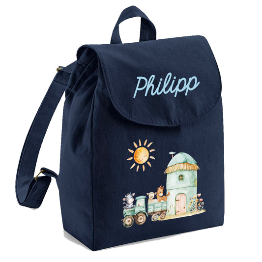 Personalisierter Rucksack aus Bio Baumwolle Kinderrucksack Name und Motiv Bauernhof bedruckt verschiedene Farben