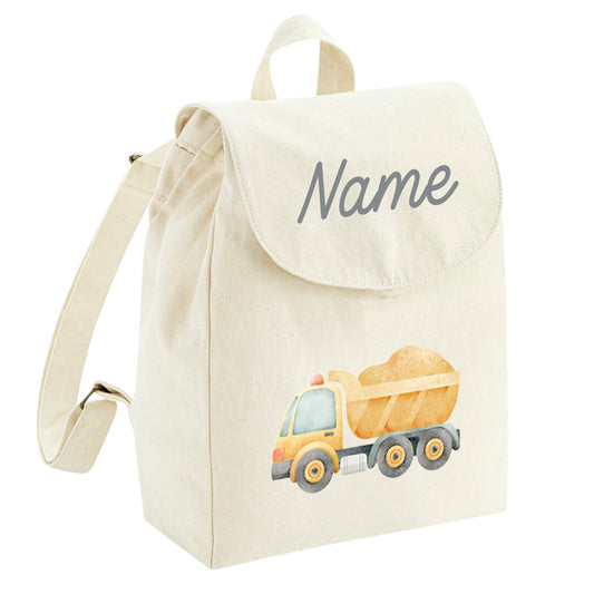 Personalisierter Rucksack aus Bio Baumwolle Kinderrucksack Name und Fahrzeug Motiv bedruckt verschiedene Farben