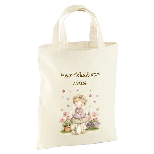 Personalisierte Freundebuch Tasche mit Namen, Baumwolle Stofftasche, Motiv Fee auf Pilz