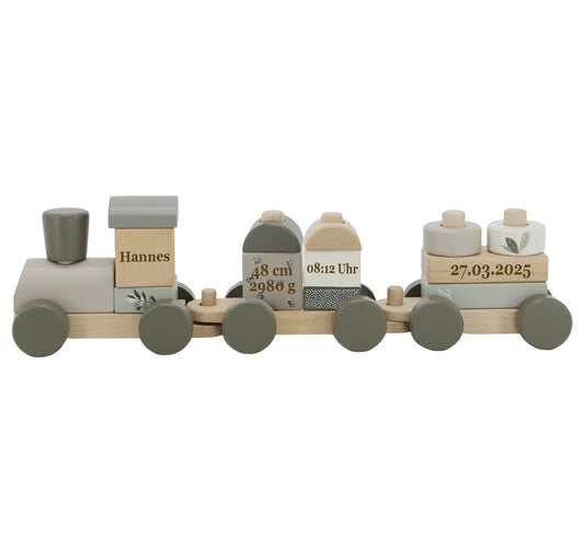 Holzzug Holz Eisenbahn oliv personalisiert mit Name und Geburtsdaten Baby Geschenk mit Gravur
