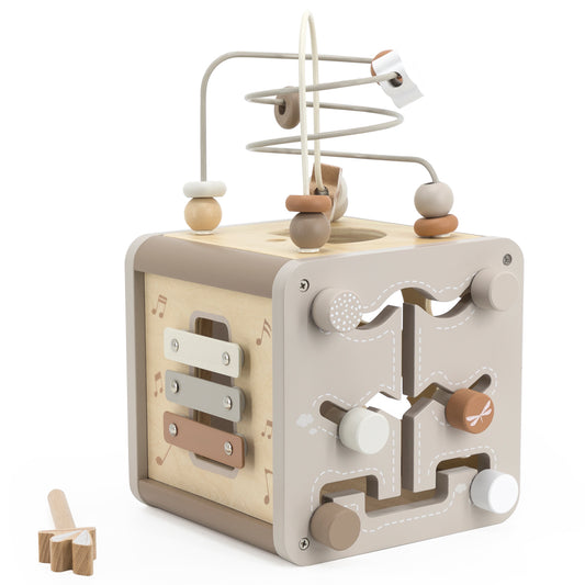 Motorikwürfel aus Holz Aktivitätswürfel für Babys, personalisiert mit Namen, ab 18 Monaten Beige