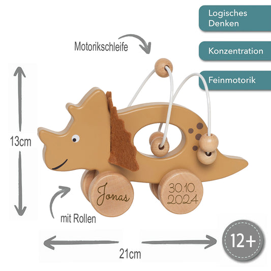Schiebetier Dinosaurier aus Holz mit Motorikschleife personalisiert mit Name und Geburtsdatum des Kindes Greiftier Rolltier ab 12 Monate
