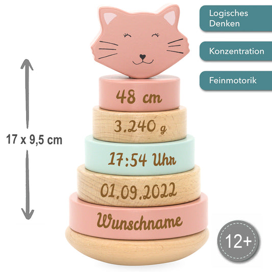 Personalisierter Stapelturm aus Holz von Trixie mit Namen und Geburtsdaten graviert Geburtsgeschenk KATZE
