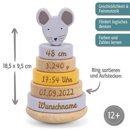 Personalisierter Stapelturm aus Holz von Trixie mit Namen und Geburtsdaten graviert Geburtsgeschenk Maus