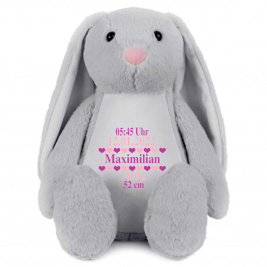 Stofftier Hase Grau mit Name personalisiert Kuscheltier Stoffhase für Kinder Flauschiges Plüschtier 40cm Motiv Name und Datum