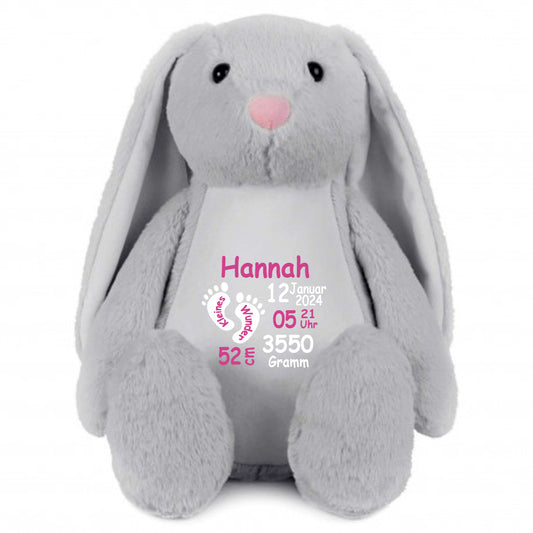Stofftier Hase Grau mit Name personalisiert Kuscheltier Stoffhase für Kinder Flauschiges Plüschtier 40cm Motiv Geburt