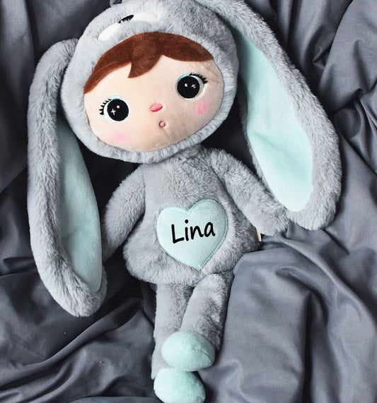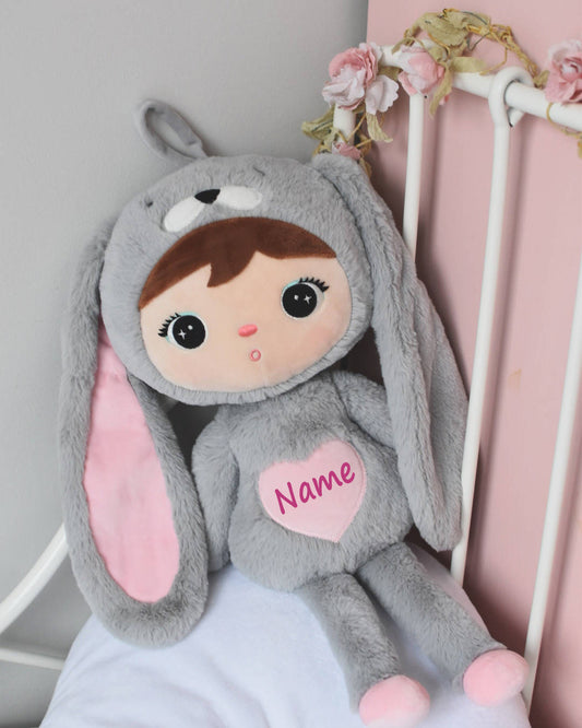Stoffpuppe Hasenmädchen mit Namen personalisiert Grau