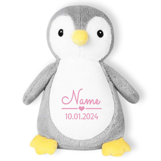 Stofftier Pinguin grau mit Name personalisiert Kuscheltier für Kinder Flauschiges Plüschtier 40cm Motiv Name und Datum