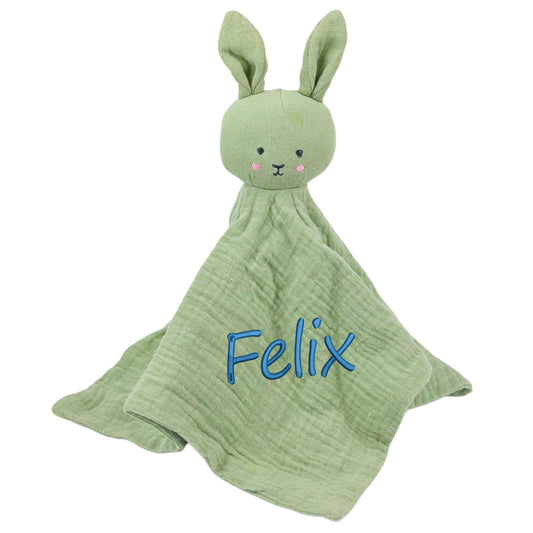 Schnuffeltuch aus Musselin mit Namen bestick Hase grün * Schmusetuch aus Baumwolle * Kuscheltuch für Babys