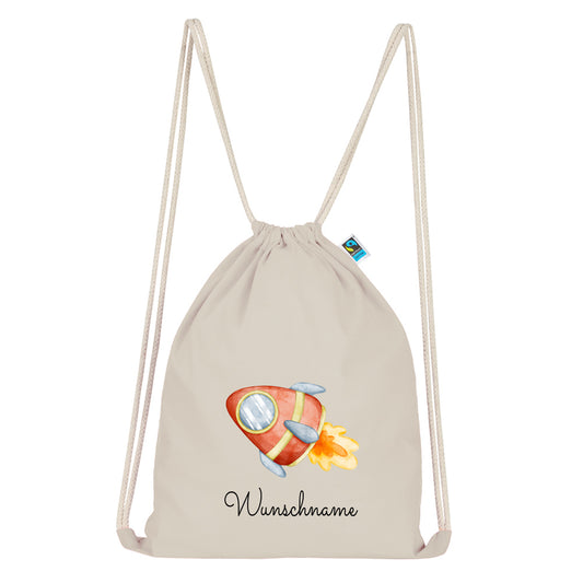 Personalisierter Turnbeutel aus Bio Baumwolle Wäschebeutel für Kinder Stoffbeutel mit Name und Motiv Rakete bedruckt