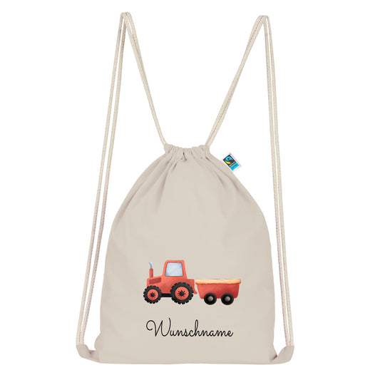 Personalisierter Turnbeutel aus Bio Baumwolle Wäschebeutel für Kinder Stoffbeutel mit Name und Motiv Trecker bedruckt