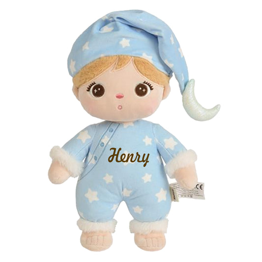Personalisierte Schlafpuppe mit Schlafmütze weiche Plüschpuppe mit Namen Sternenmuster Schlafanzug Hellblau