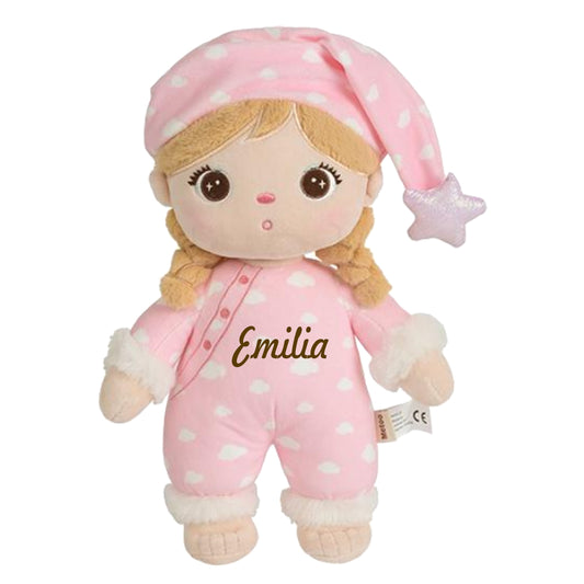 Personalisierte Schlafpuppe mit Schlafmütze weiche Plüschpuppe mit Namen Sternenmuster Schlafanzug Rosa