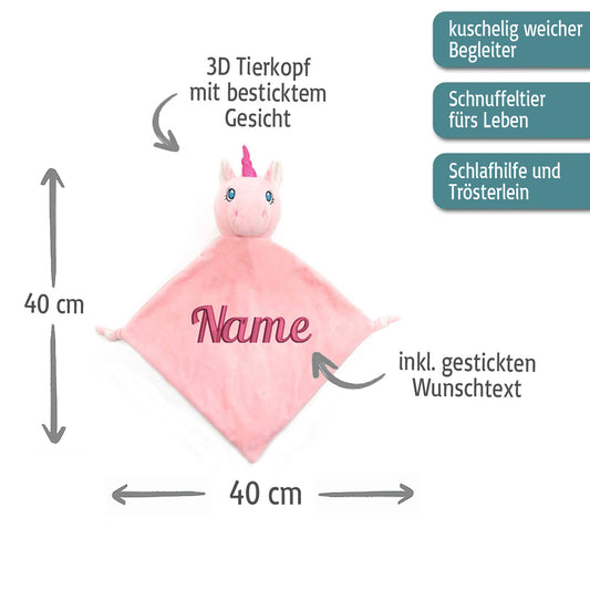 Personalisiertes Schnuffeltuch weiches Kuscheltuch mit Name Bestickt Schnuffeltier Schlafhilfe Tröster Geschenk zur Geburt Einhorn rosa