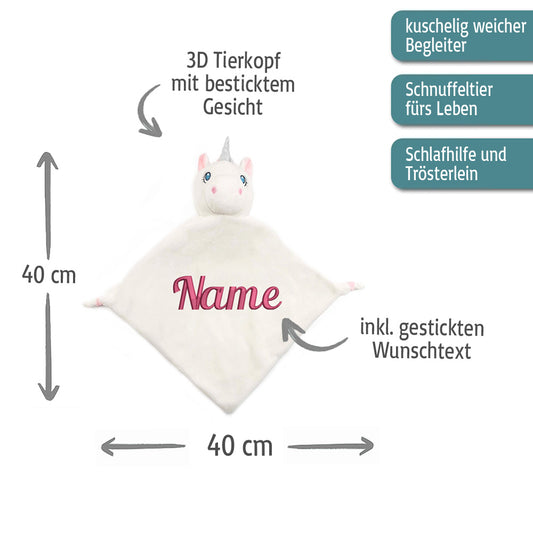 Personalisiertes Schnuffeltuch weiches Kuscheltuch mit Name Bestickt Schnuffeltier Schlafhilfe Tröster Geschenk zur Geburt Einhorn weiß