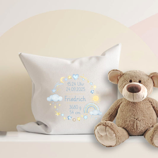 Personalisiertes Geburtskissen mit Regenbogen-Motiv, Geburtsdaten und Wunschname, Geschenk zur Geburt