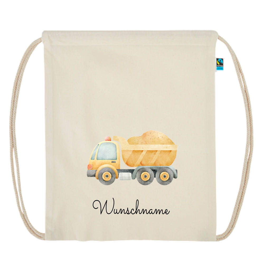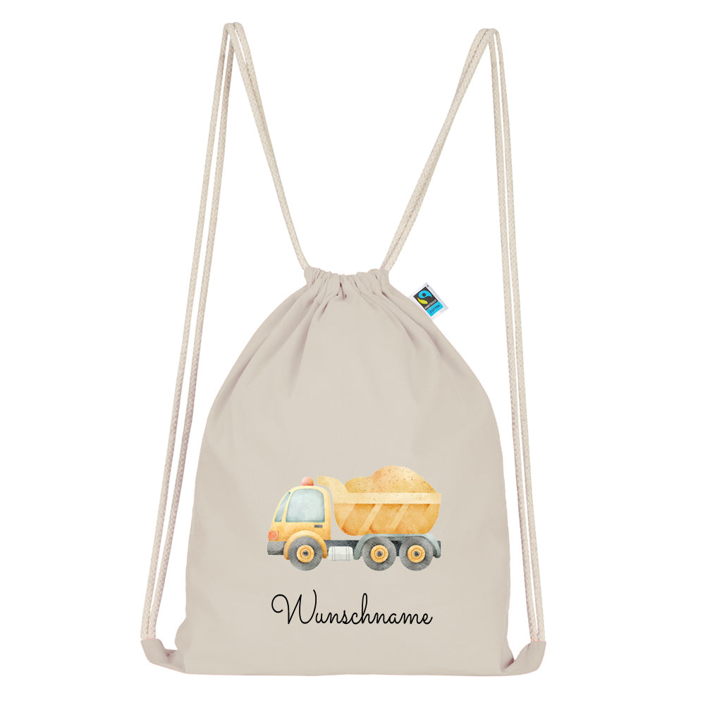 Personalisierter Turnbeutel aus Bio Baumwolle Wäschebeutel für Kinder Stoffbeutel mit Name und Motiv Kipplader bedruckt