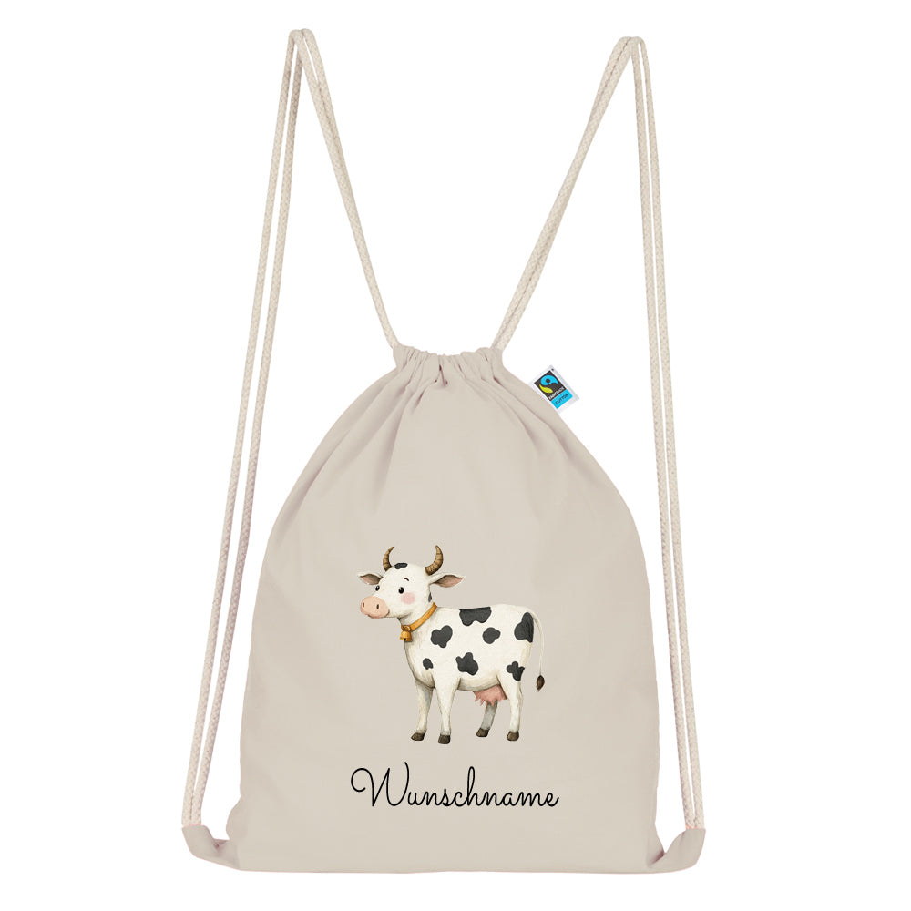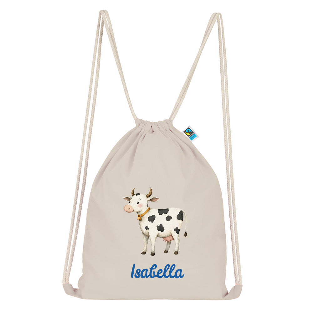PERSONALISIERTER TURNBEUTEL AUS BIO BAUMWOLLE mit Ihrem Wunschnamen oder Text und dem Kuh Motiv bedruckt, hinterlegen Sie Ihre Daten