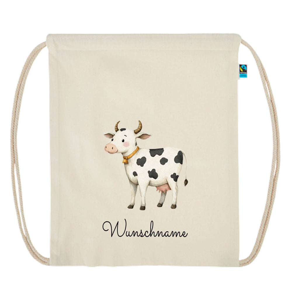 Personalisierter Turnbeutel aus Bio Baumwolle Wäschebeutel für Kinder Stoffbeutel mit Name und Motiv Kuh bedruckt
