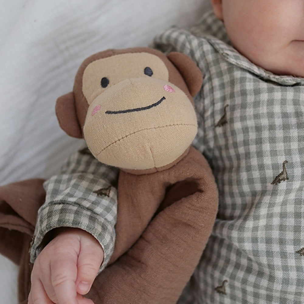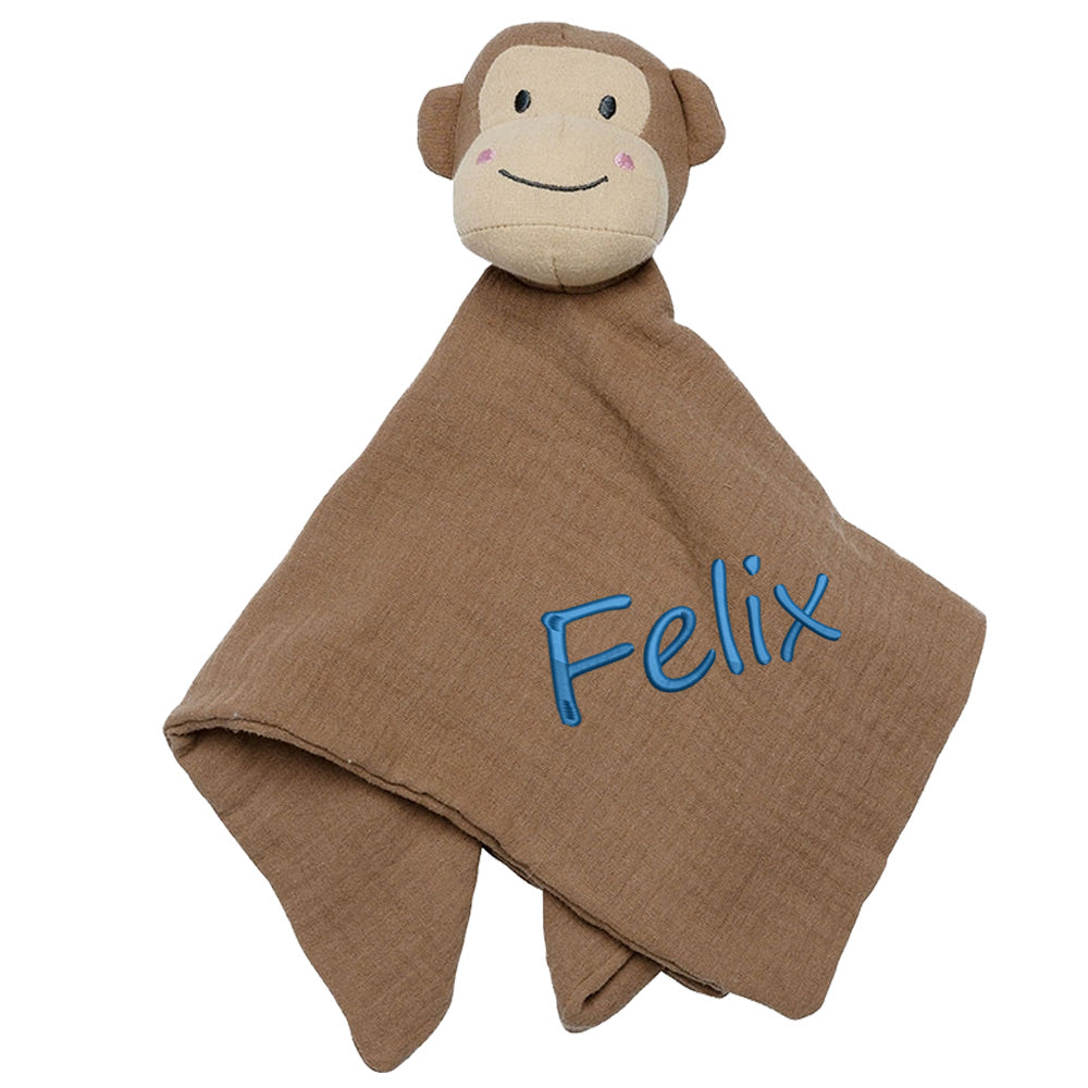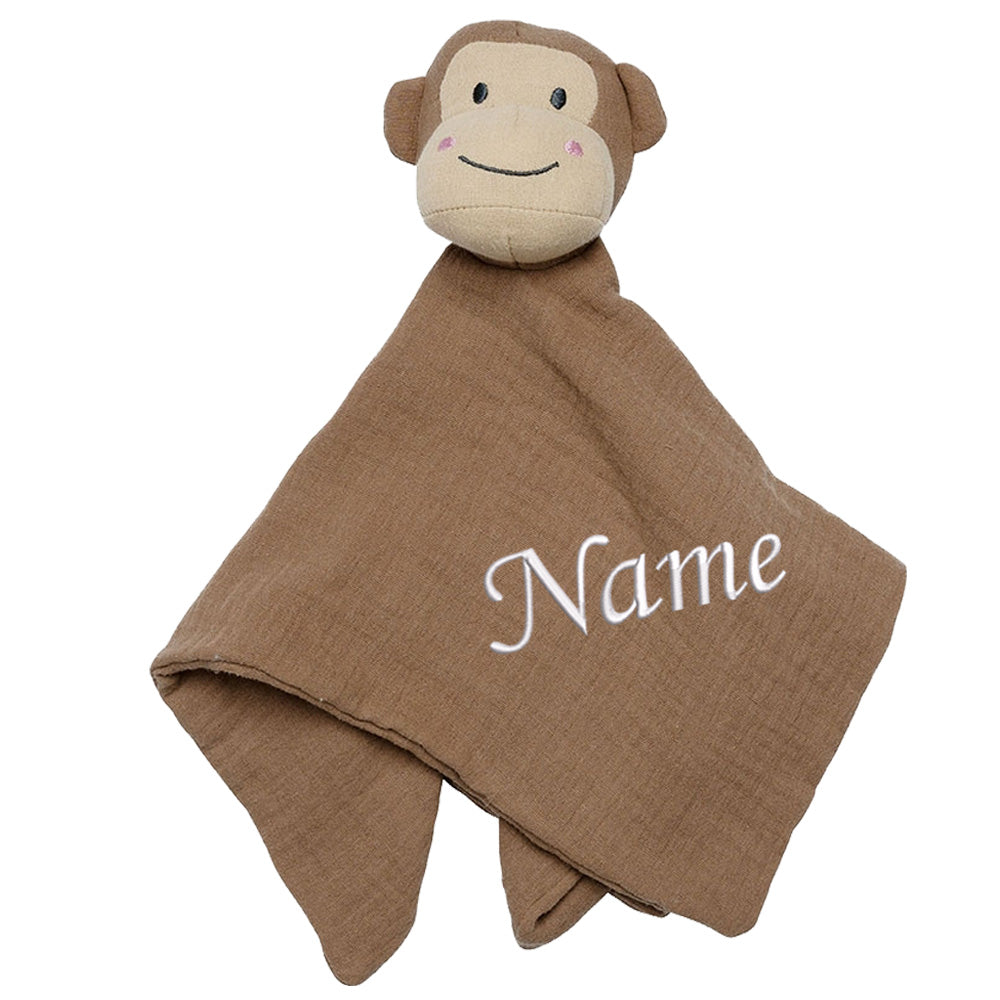 Schnuffeltuch aus Musselin mit Namen bestick Affe braun * Schmusetuch aus Baumwolle * Kuscheltuch für Babys