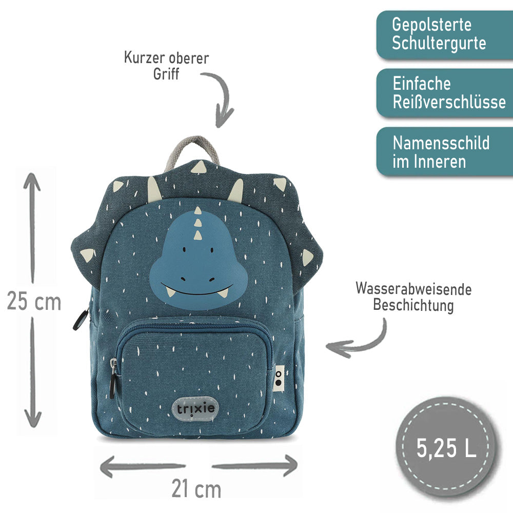 DIE KINDERFREUNDLICHEN REIßVERSCHLÜSSE sind gut zu greifen und leicht zu öffnen. Der kleine Rucksack mit den Maßen: 21x10x25cm (LxBxH) verfügt außerdem über eine kleine Fronttasche und ein Fach im Inneren. Außenmaterial aus 60% recycelter Baumwolle, 35% Baumwolle und 5% Viskose, mit einer wasserabweisenden Acrylbeschichtung.