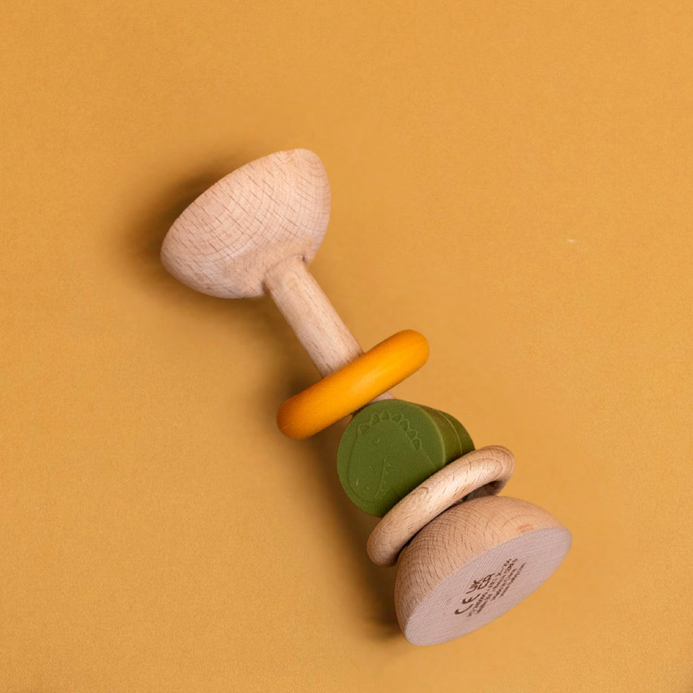 Trixie Rassel Baby aus Holz und Silikon PERSONALISIERT mit Name graviert Greifstab für Baby Geschenk zur Geburt Dino